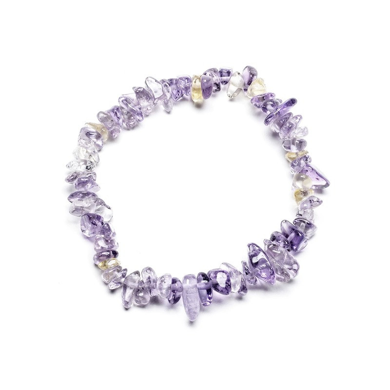 Bransoletka z ametystu - naturalne kamienie Elegancka i ponadczasowa bransoletka wykonana z naturalnego ametystu. Jej charakterystyczna, fioletowa barwa nadaje biżuterii wyjątkowego uroku i sprawia, że doskonale komponuje się zarówno z codziennymi, jak i bardziej eleganckimi stylizacjami. Bransoletka składa się z drobnych, nieregularnych kamieni typu „chips”, które zostały wygładzone i wypolerowane, dzięki czemu są przyjemne w noszeniu. Bransoletka wykonana jest z naturalnych kamieni,...